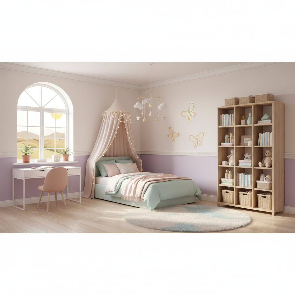 База — теплий білий, світлий дуб, світло-сірий. Акценти — лавандовий та м’ятний у подушках і постерах. Ліжко на низьких ніжках, стелаж-куби, кошики з підписами. Над столом — рейка з органайзерами, лампа 4000K. На підлозі — плетений килим. Декор — балдахін з тонкої бавовни та мобіль із дерев’яних фігурок. Плюс: легко оновлювати кольорами текстилю, інтер’єр тримає спокійний настрій.